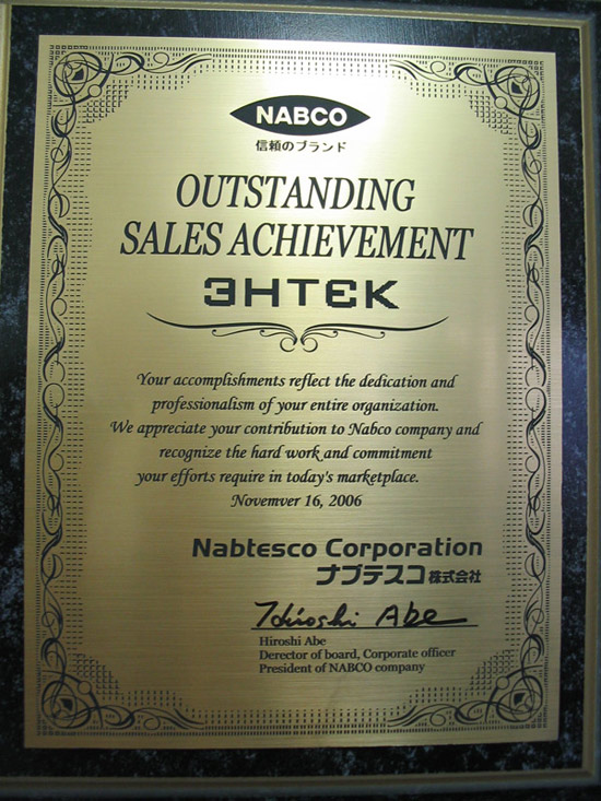 С 16.11.06 по 22.11.06 Россию посетил президент компании NABCO господин Hiroshi Abe. В ходе встречи в офисе компании “ЭНТЕК президент NABCO высоко оценил рост продаж и долю рынка в России и поблагодарил всех партнеров и дилеров компании “ЭНТЕК” за усилия по профессиональному продвижению автоматических дверей NABCO в России. Также обсуждались вопросы сотрудничества, перспективы развития рынка и характеристики нового поколения приводов NABCO.